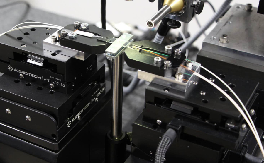Photonik-Komponenten mit Submikrometer-Toleranzen. Die Präzisionsmechanik ist mit dem A3200-Controller von Aerotech gekoppelt, also einem Bewegungsregler mit niedriger Latenz und vorgeschriebenen