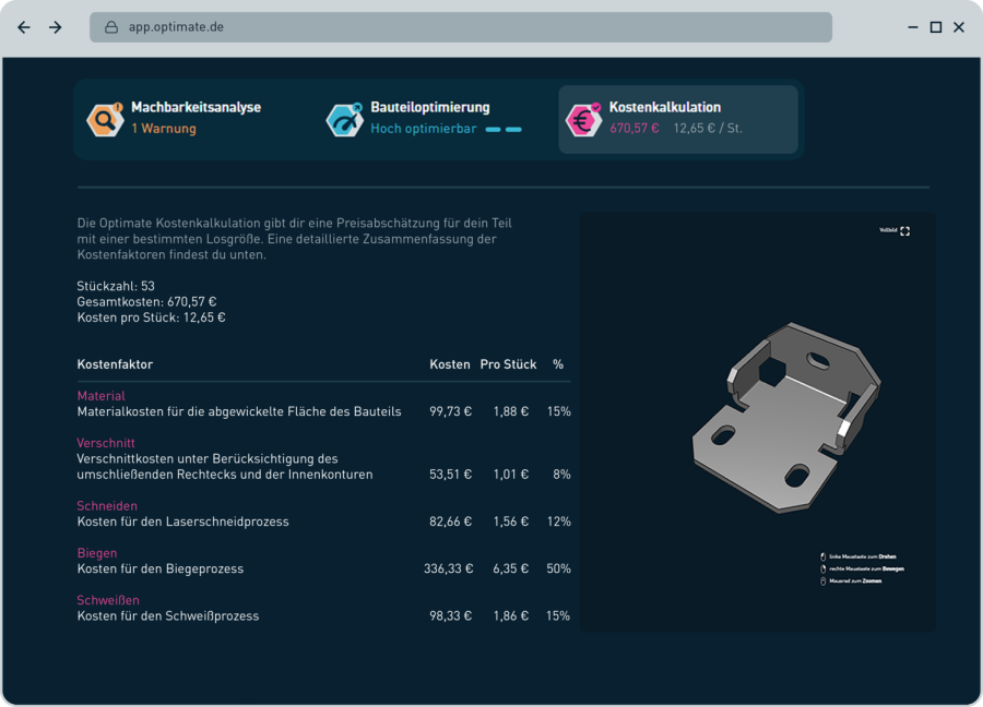 Als neue Features kamen die Baugruppenanalyse und die Kostenkalkulation hinzu. „Wir starteten 2020 mit den Bereichen Machbarkeitsprüfung und Optimierung und haben diese nun um eine Kostenkalkulation erweitert“, so CSO Sebastian Beger. Der Anwender bekommt nun gleich beim Einstieg in die App die drei Möglichkeiten der digitalen Unterstützung angezeigt. „Lädt ein Anwender seine Bauteile über den Browser in die App hoch, sieht er binnen weniger Sekunden Machbarkeitswarnungen wie auch Optimierungspotential auf dem Bildschirm“, präzisiert Beger. Und Jonas Steiling ergänzt: „Mit der Nutzung unserer Kostenkalkulation können Konstrukteure von Blechbauteilen mögliche Kostentreiber bereits im Entstehungsprozess identifizieren.“ Neben der Analyse von einzelnen Bauteilen lassen sich zudem Baugruppen mit bis zu 25 Einzelteilen auf Machbarkeit und Optimierungspotential prüfen. So können Anwender in der Konstruktion eine komplette Baugruppe in die Optimate-App hochladen, die dann zerlegt und auf Machbarkeit geprüft wird.