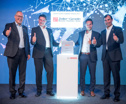 EISLINGEN, 28. Juli 2017 – Wer mit dem Bosch Global Supplier Award ausgezeichnet wird, der gehört zu den Besten seiner Sparte: Schmierstoffexperte Zeller+Gmelin erhielt die Auszeichnung in diesem Jahr zum sechsten Male in der Kategorie „Indirekter Einkauf“ und steht damit in einer Reihe namhafter Industriezulieferer wie Balluff, Chiron oder der Hoffmann Gruppe. Seit vielen Jahren setzt Bosch in den weltweiten Fertigungswerken erfolgreich hochwertige und teilweise speziell für Bosch entwickelte Schmierstoffe von Zeller+Gmelin ein. Zeller+Gmelin ist es zusätzlich gelungen sich als Lieferant von unterschiedlichen Kalibrierflüssigkeiten u. a für die Endabprüfung der Diesel-Einspritzausrüstung zu etablieren.